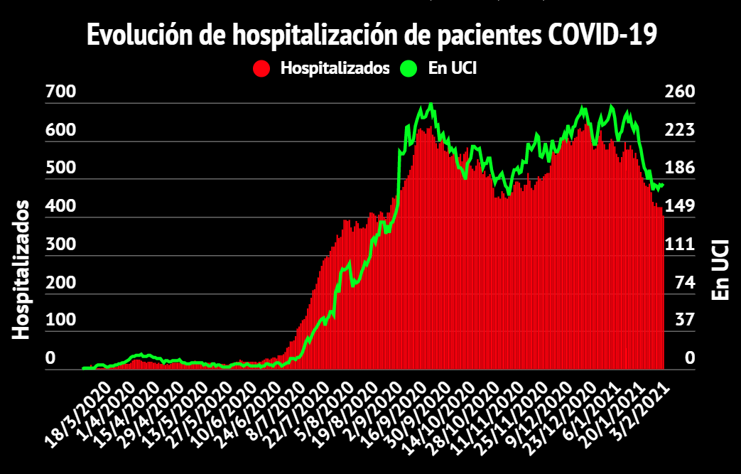 Hay 402 personas hospitalizadas (-24 respecto a ayer) de las cuales 181 están internadas en Unidades de Cuidados Intensivos (+2) con edades de entre 0 a 94 años. La cifra de personas hospitalizadas es la más baja desde el 26 de agosto del 2020, cuando eran 400 personas.