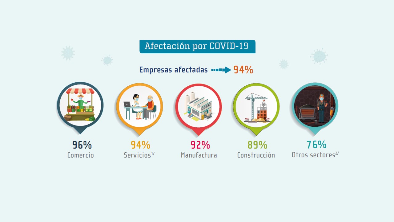 Adicionalmente, los resultados señalan que el sector que presentó mayor afectación por la crisis de COVID-19 fue el de Comercio, en donde 96 de cada 100 empresas manifestó haber tenido algún tipo de consecuencia por la pandemia, mientras que la categoría “Otros sectores” fue la que menor afectación reportó, aún así 76 de cada 100 empresas señalaron tener consecuencias directas por la crisis.