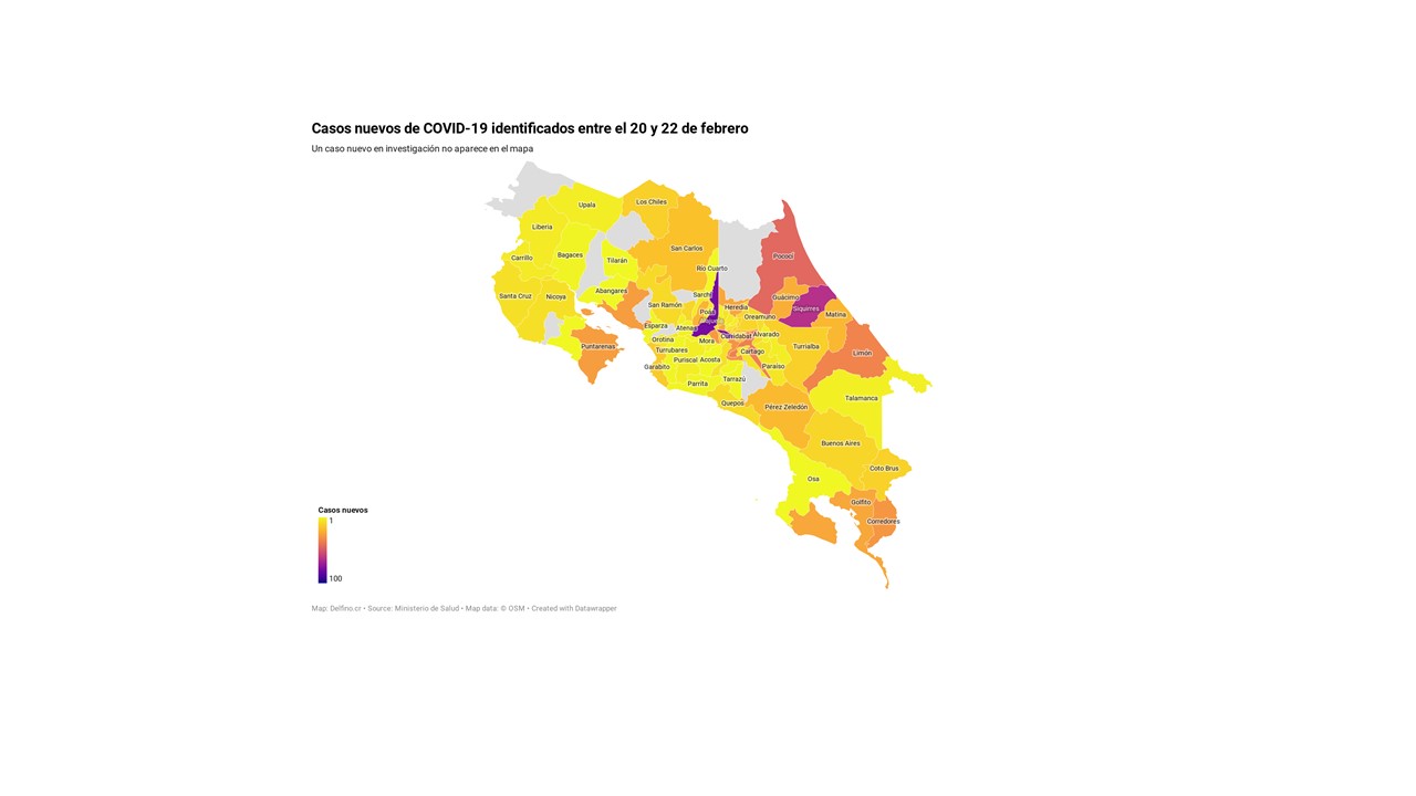 El Ministerio de Salud de Costa Rica informó la tarde de hoy que los 996 casos nuevos de COVID-19 registrados entre el 20 y 22 de febrero en el país se ubican en 73 de los 82 cantones. Los que no reportaron casos nuevos son: Cañas, Dota, Guatuso, Hojancha, La Cruz, Montes de Oro, San Mateo, Sarapiquí y Zarcero.