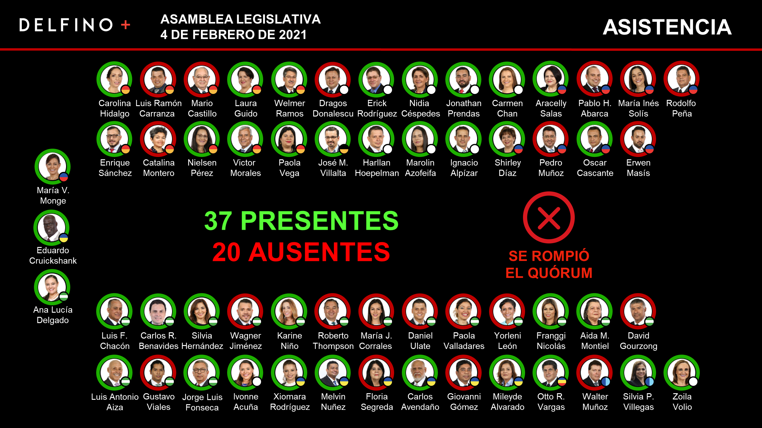 Según las listas de asistencia antes y después de la ruptura de quorum, este jueves solo se apersonaron 46 diputados y al finalizar había 37, es decir, nueve de ellos "se fugaron".