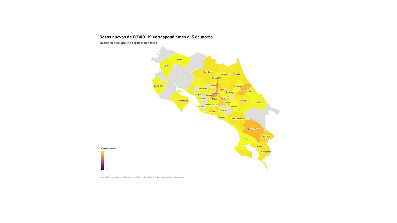 Un caso nuevo no fue ubicado en ningún cantón pues sigue bajo investigación. El número de casos pendientes de domicilio cantonal asciende ya a 544, de los cuales 28 casos están activos.