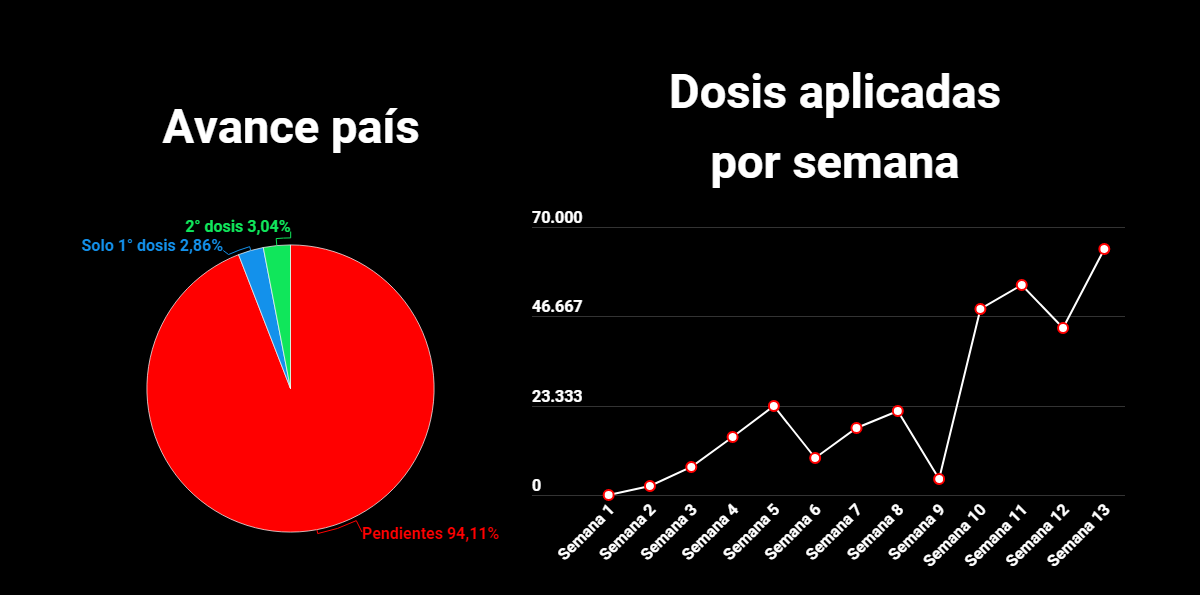 Costa Rica alcanza una tasa de vacunación de 6.05 por cada 100 habitantes. El 2.86% de la población a vacunar (3.70 millones en total) ha recibido solo su primera dosis, mientras que el 3.04% del total ya tiene su segunda dosis, quedando pendiente de recibir dosis el 94.11% de la población objetivo.