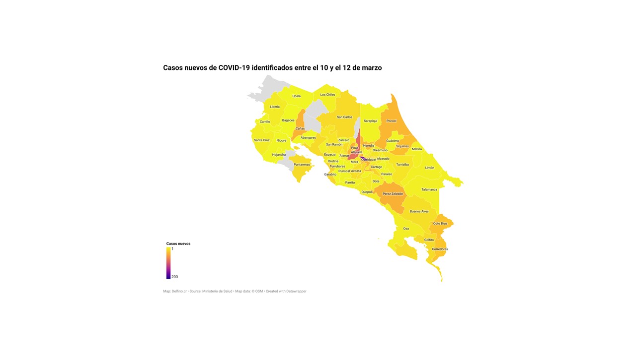 El Ministerio de Salud de Costa Rica informó la tarde de hoy que los 1261 casos nuevos de COVID-19 registrados en el país entre el 10 y el 12 de marzo se ubican en 77 de los 82 cantones. Los que no reportaron casos nuevos son: Guatuso, La Cruz, Nandayure, Río Cuarto y Tilarán.