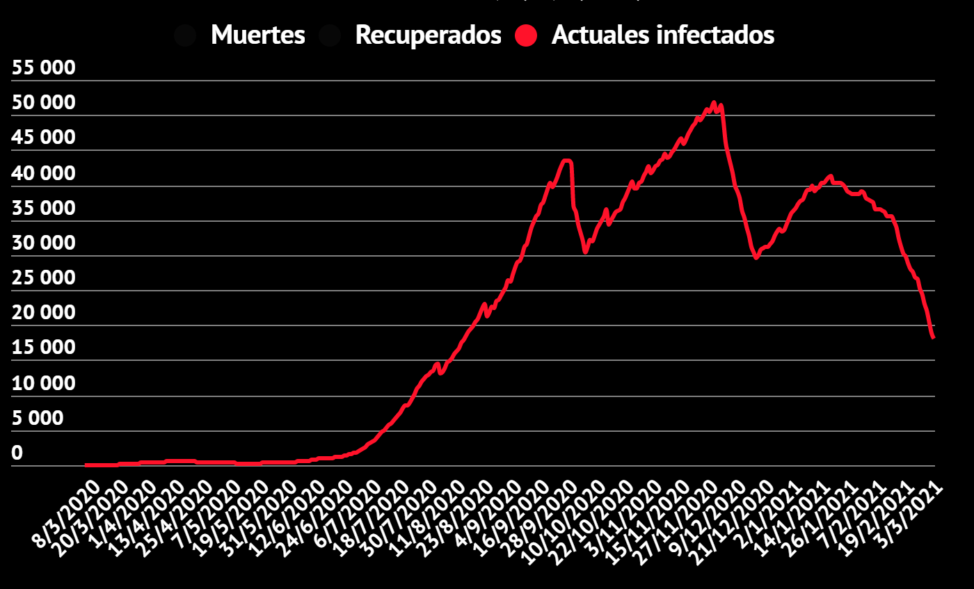 Hay 185.045 personas recuperadas (+1134 más que ayer) y 2824 fallecidas (+4), por lo que la cantidad de casos activos (actuales infectados) es de 18.021. El número de casos activos bajó un -4.05% respecto al día previo (-762) y suma 18 días consecutivos de descenso.