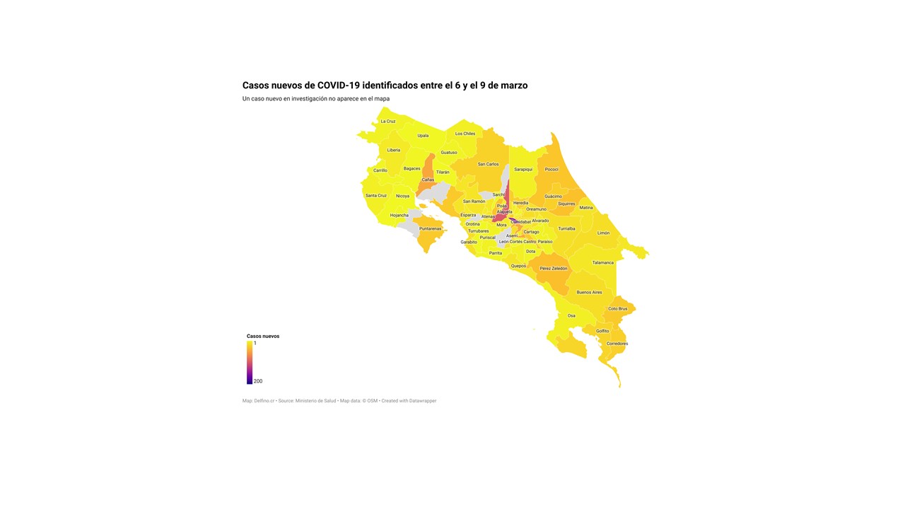 El Ministerio de Salud de Costa Rica informó la tarde de hoy que los 1192 casos nuevos de COVID-19 registrados en el país entre el 6 y el 9 de marzo se ubican 76 de los 82 cantones. Los que no reportaron casos nuevos son: Abangares, Acosta, Nandayure, Río Cuarto, San Mateo y Zarcero.