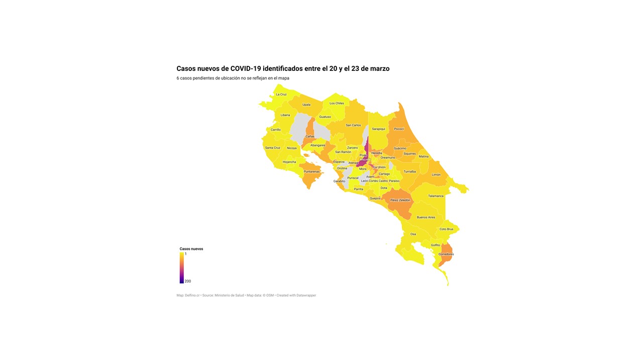 Otros 6 casos nuevos no fueron ubicados en ningún cantón pues siguen bajo investigación. El número de casos pendientes de domicilio cantonal asciende ya a 531, de los cuales 19 casos están activos.