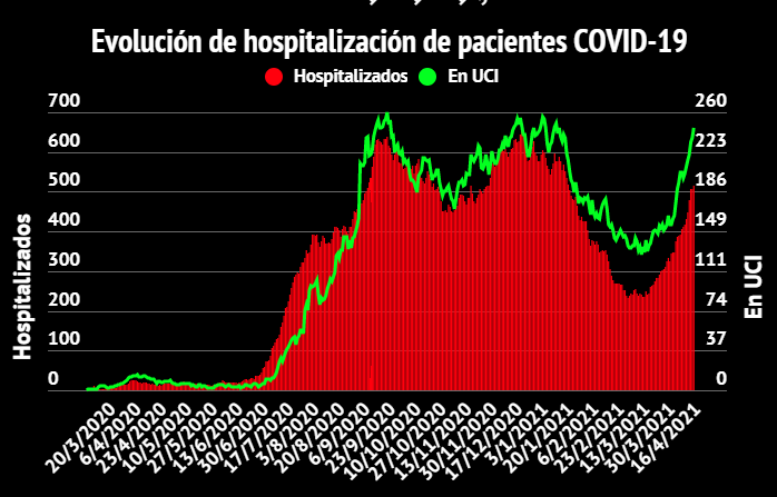 La cifra de personas hospitalizadas de este viernes es la más alta desde el 21 de enero del 2021, cuando se reportaron 519 hospitalizados. Asimismo, la cifra de personas en UCI es la más alta desde el 13 de enero del mismo año, cuando se registraron 250 hospitalizados en cuidados intensivos.