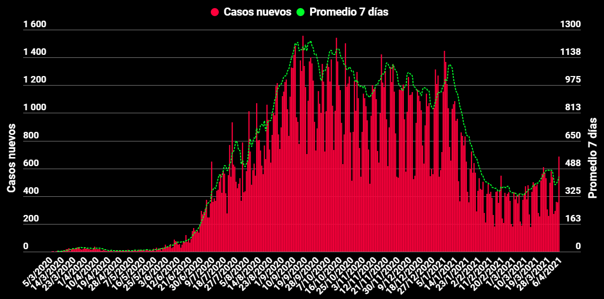 El miércoles 31 de marzo se reportaron 582 casos nuevos, el jueves 1 de abril se reportaron 538 casos nuevos, el viernes 2 de abril se reportaron 272 casos nuevos, el sábado 3 de abril se reportaron 293 casos nuevos, el domingo 4 de abril se reportaron 359 casos nuevos, el lunes 5 de abril se reportaron 354 casos nuevos y este martes 6 de abril se registran 684 casos nuevos.