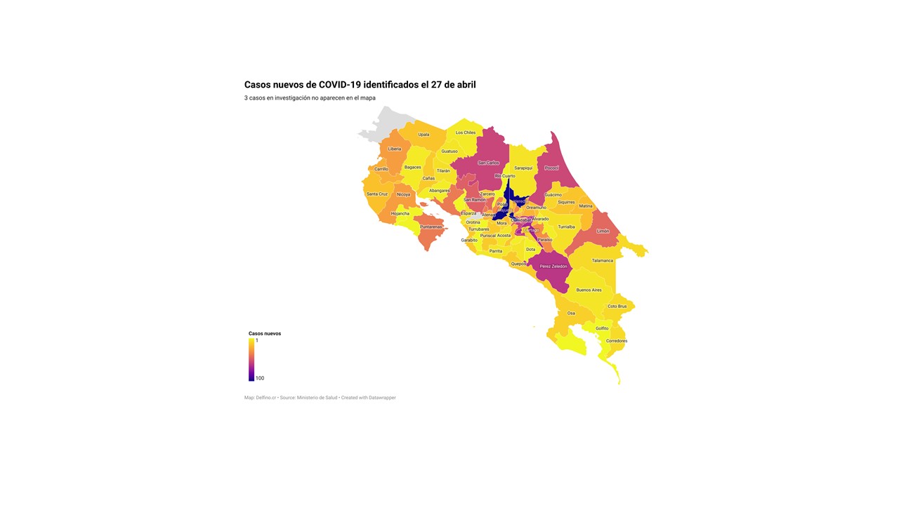 El Ministerio de Salud de Costa Rica informó la tarde de hoy que los 1927 casos nuevos de COVID-19 registrados en el país se ubican en 80 de los 82 cantones. Los que no reportaron casos nuevos son: La Cruz y San Mateo.
