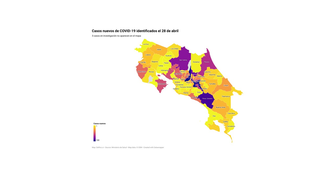 Otros 3 casos nuevos no fueron ubicados en ningún cantón pues siguen bajo investigación. El número de casos pendientes de domicilio cantonal asciende ya a 543, de los cuales 42 casos están activos.