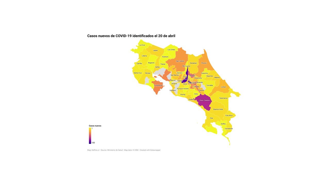 El Ministerio de Salud de Costa Rica informó la tarde de hoy que los 1130 casos nuevos de COVID-19 registrados en el país se ubican en 76 de los 82 cantones. Los que no reportaron casos nuevos son: Jiménez, Montes de Oro, Turrubares, Hojancha, Abangares y San Mateo.