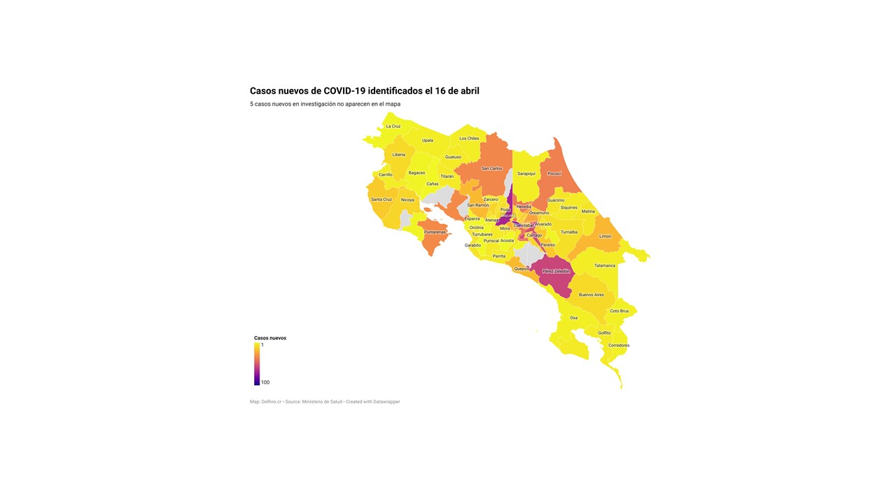 Otros 5 casos nuevos no fueron ubicados en ningún cantón pues siguen bajo investigación. El número de casos pendientes de domicilio cantonal asciende ya a 540, de los cuales 37 casos están activos.