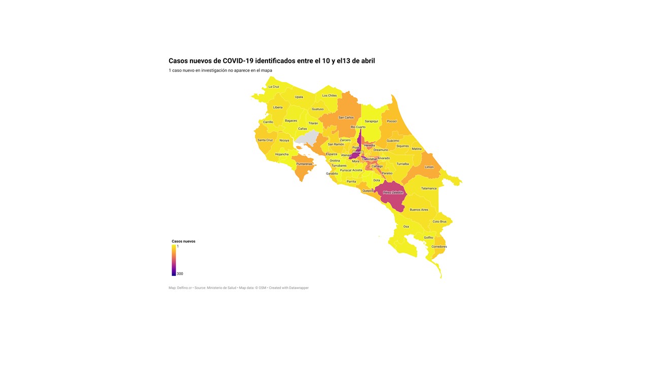 Un casos nuevo no fue ubicado en ningún cantón pues sigue bajo investigación. El número de casos pendientes de domicilio cantonal asciende ya a 529, de los cuales 27 casos están activos.
