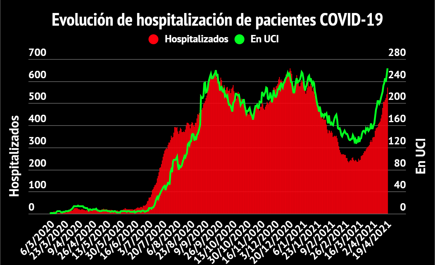 La cifra de personas hospitalizadas de este lunes es la más alta desde el 16 de enero de 2021 cuando era de 577. Sin embargo, Costa Rica rompió este lunes su lamentable récord previo de personas en cuidados intensivos, ya que la cifra reportada para hoy es la más alta de toda la emergencia sanitaria en el país. Según los registros, el sábado fueron hospitalizadas 55 personas, el domingo 57 más y este lunes otras 49.