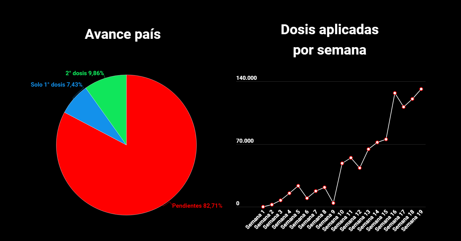 Costa Rica alcanza una tasa de vacunación de 18.40 por cada 100 habitantes. El 7.43% de la población a vacunar (3.50 millones en total) ha recibido solo su primera dosis, mientras que el 9.86% del total ya tiene su segunda dosis, quedando pendiente de recibir dosis el 82.71% de la población objetivo.