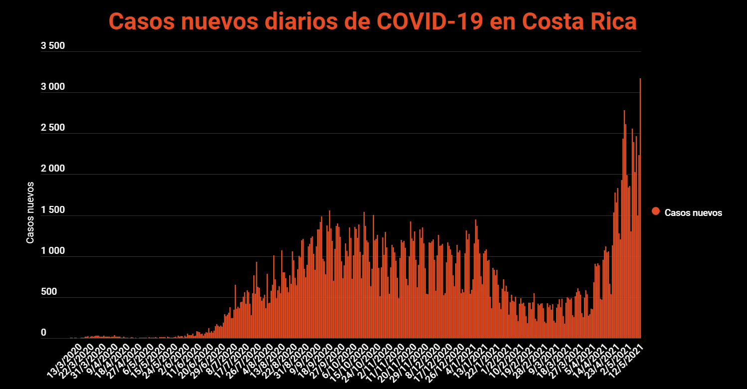 El Ministerio de Salud de Costa Rica confirmó este 12 de mayo 3173 nuevos casos de COVID-19 en el país, con lo cual la cifra total de casos se eleva a 276.887. Respecto al día de ayer, la variación de los casos confirmados fue del 1.15%.