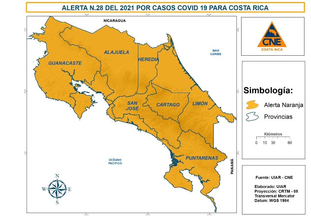 La Comisión Nacional de Emergencias (CNE) elevó a alerta naranja los últimos 10 cantones del país que se encontraban en alerta amarilla, con lo cual la totalidad del país se encuentra ahora bajo el penúltimo nivel de alerta más elevado por la pandemia de COVID-19.