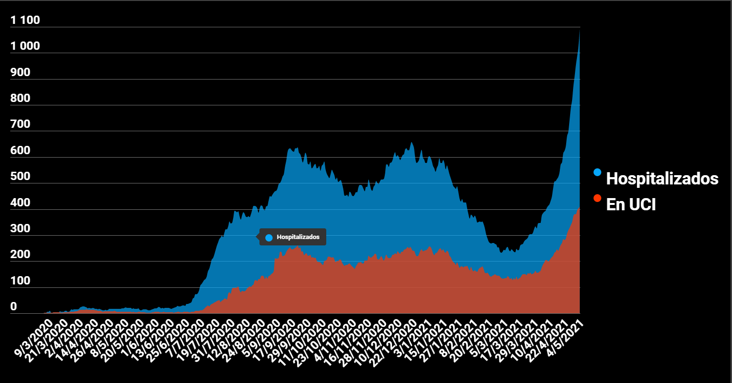 Hay 1091 personas hospitalizadas (+67) de las cuales 408 están internadas en Unidades de Cuidados Intensivos (+5) con edades de entre 0 a 83 años.
