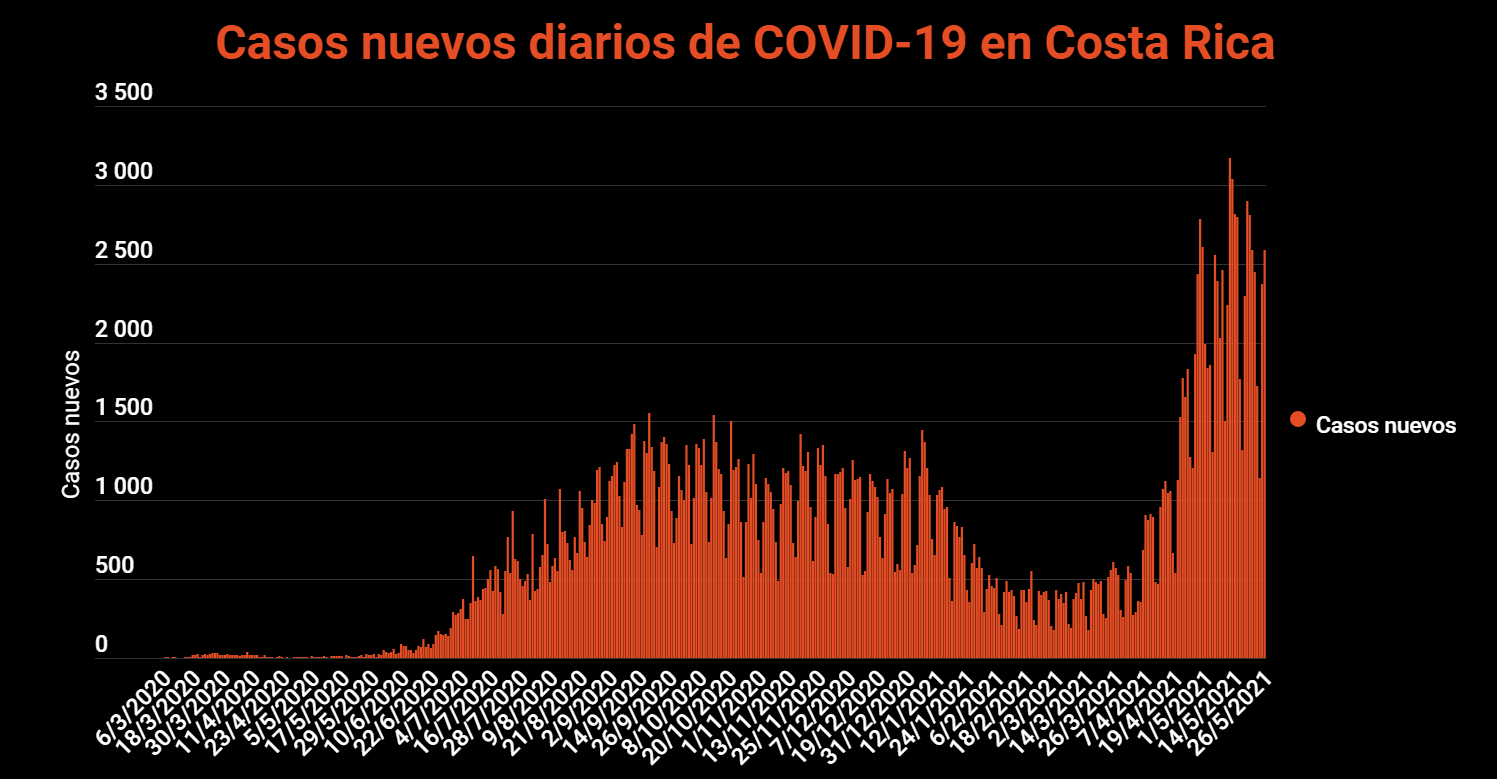 El Ministerio de Salud de Costa Rica confirmó este 26 de mayo 2587 nuevos casos de COVID-19 en el país, con lo cual la cifra total de casos se eleva a 309.486. Respecto al día de ayer, la variación de los casos confirmados fue del 0.84%.