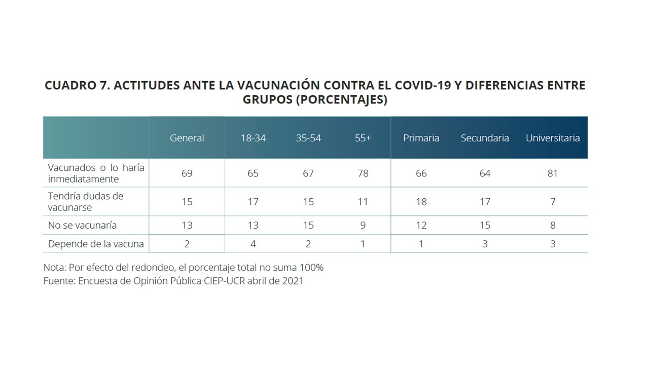 El Centro de Investigación y Estudios Políticos (CIEP) de la Universidad de Costa Rica presentó hoy los resultados de su Estudio de Opinión Sociopolítica correspondiente al mes de abril 2021, donde uno de los principales resultados es que, aproximadamente, 1 de cada 8 personas encuestadas (13%) señaló no estar dispuesta a recibir la vacuna contra la COVID-19.