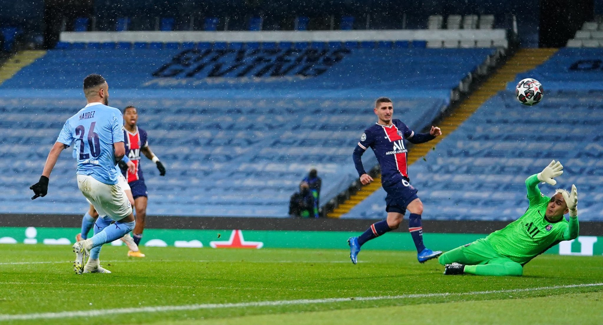 Tras el tanto de Mahrez, Marquinhos cabeceó al larguero y Di María rozó el gol tras un error en la salida de balón del equipo inglés y con Ederson descolocado. Poco a poco el conjunto de Mauricio Pochettino fue perdiendo fuelle y el City pudo sobrevivir con más comodidad para llegar al descanso.