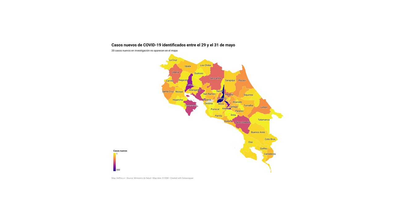 El Ministerio de Salud de Costa Rica informó la tarde de hoy que los 4884 casos nuevos de COVID-19 registrados en el país del 29 al 31 de mayo se ubican en 81 de los 82 cantones. El único que no reportó casos fue San Mateo.