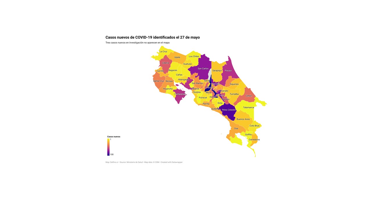 Otros 3 casos nuevos no fueron ubicados en ningún cantón pues siguen bajo investigación. El número de casos pendientes de domicilio cantonal asciende ya a 616, de los cuales 99 casos están activos.