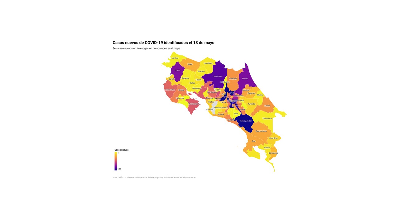 Otros 6 casos nuevos no fueron ubicados en ningún cantón pues siguen bajo investigación. El número de casos pendientes de domicilio cantonal asciende ya a 581, de los cuales 74 casos están activos.