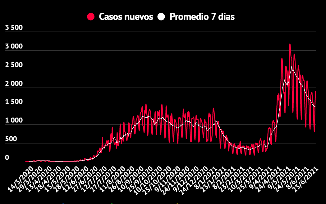De los casos registrados hoy 1524 fueron diagnosticados por prueba y 379 por nexo. Los 1903 casos de este miércoles rompen la tendencia a la baja de los casos versus la semana anterior, ya que el miércoles de la semana pasada se reportaron 1845 contagios.