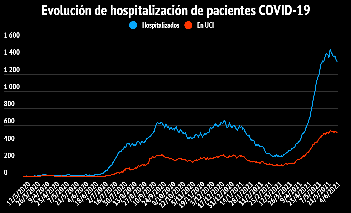 Hay 1346 personas hospitalizadas (-2) de las cuales 520 están internadas en Unidades de Cuidados Intensivos (-2) con edades de entre 0 a 92 años.