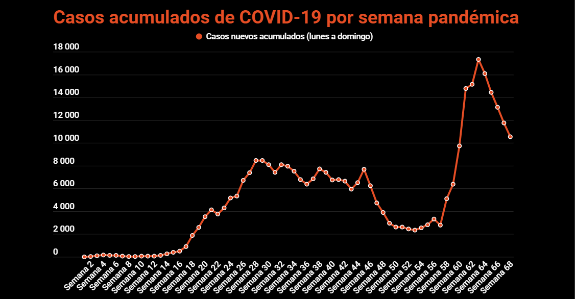 La semana pandémica 68, que terminó el domingo, cerró con 10.560 casos nuevos acumulados de COVID-19 y 137 fallecidos, cifras inferiores a los 11.746 casos y 164 fallecidos registrados en la semana 67. El promedio móvil de casos nuevos de los últimos siete días es de 1499, el más bajo desde el 26 de abril de 2021 cuando fue de 1486. La cifra de casos nuevos reportada para este lunes, es la más baja reportada en un día lunes desde la semana 60 cuando fue de 536.
