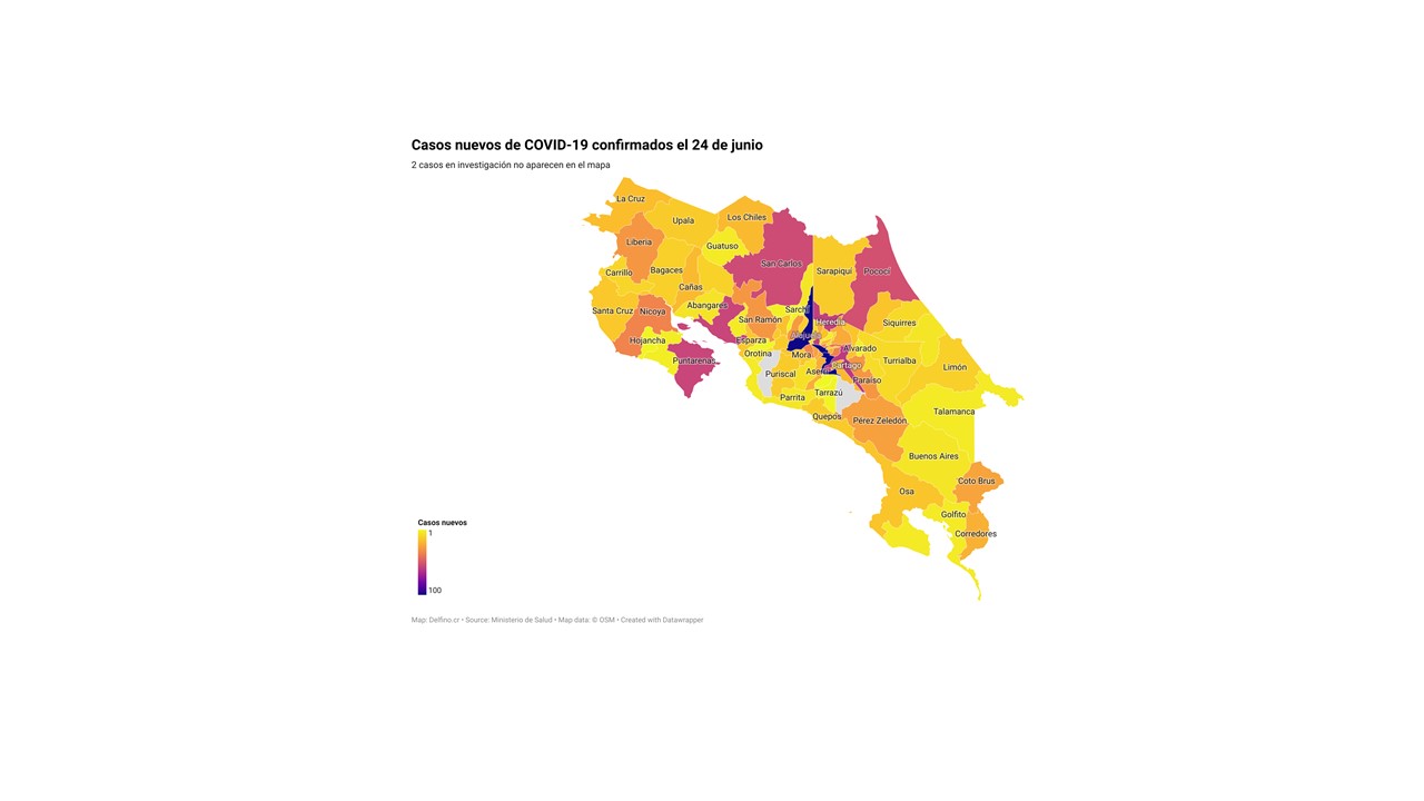 Otros 2 casos nuevos no fueron ubicados en ningún cantón pues siguen bajo investigación. El número de casos pendientes de domicilio cantonal asciende ya a 666, de los cuales 162 casos están activos.