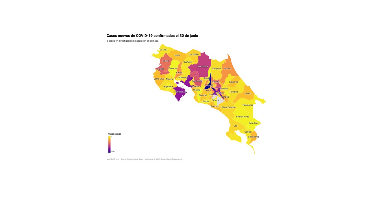 Otros 8 casos nuevos no fueron ubicados en ningún cantón pues siguen bajo investigación. El número de casos pendientes de domicilio cantonal asciende ya a 672, de los cuales 167 casos están activos.