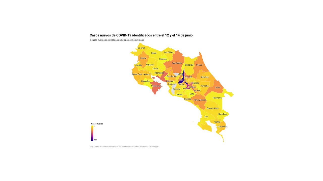 El Ministerio de Salud de Costa Rica informó la tarde de hoy que los 3704 casos nuevos de COVID-19 registrados en el país entre el 12 y el 14 de junio se ubican en 80 de los 82 cantones. Los que no reportaron casos nuevos son Turrubares y Zarcero.