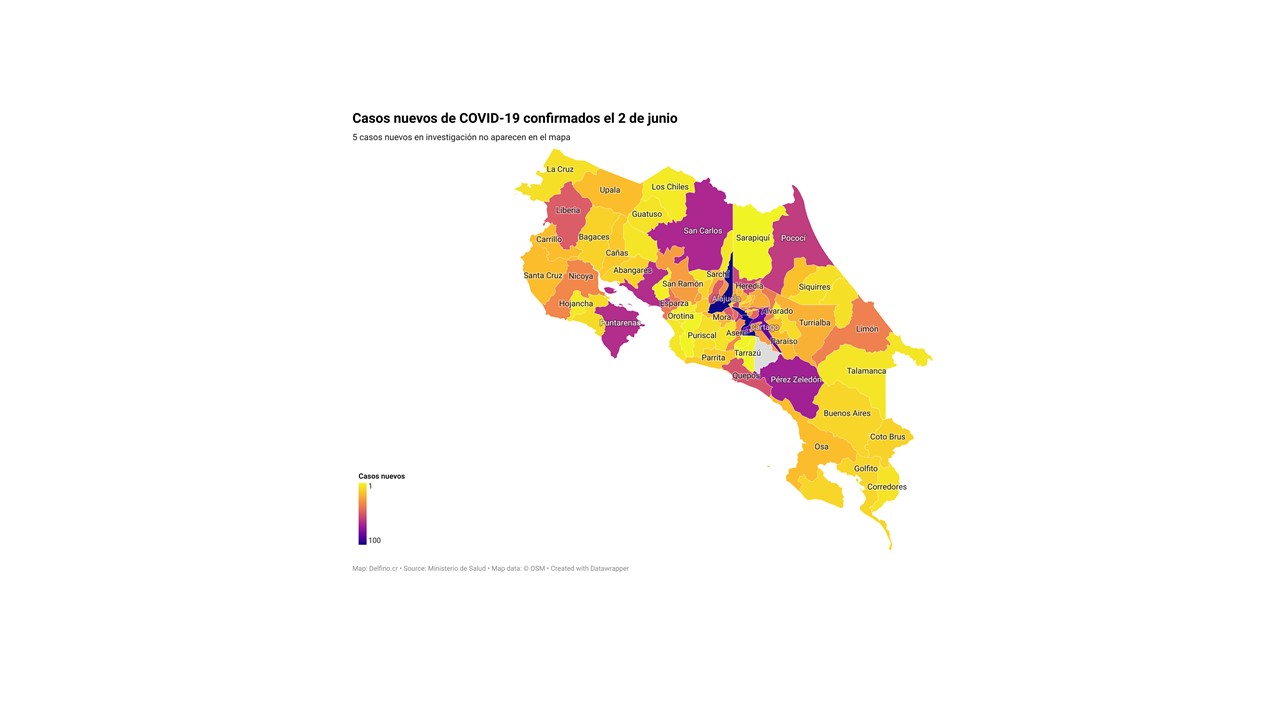 El Ministerio de Salud de Costa Rica informó la tarde de hoy que los 2293 casos nuevos de COVID-19 registrados en el país se ubican en 81 de los 82 cantones. El único que no reportó casos nuevos fue Dota.