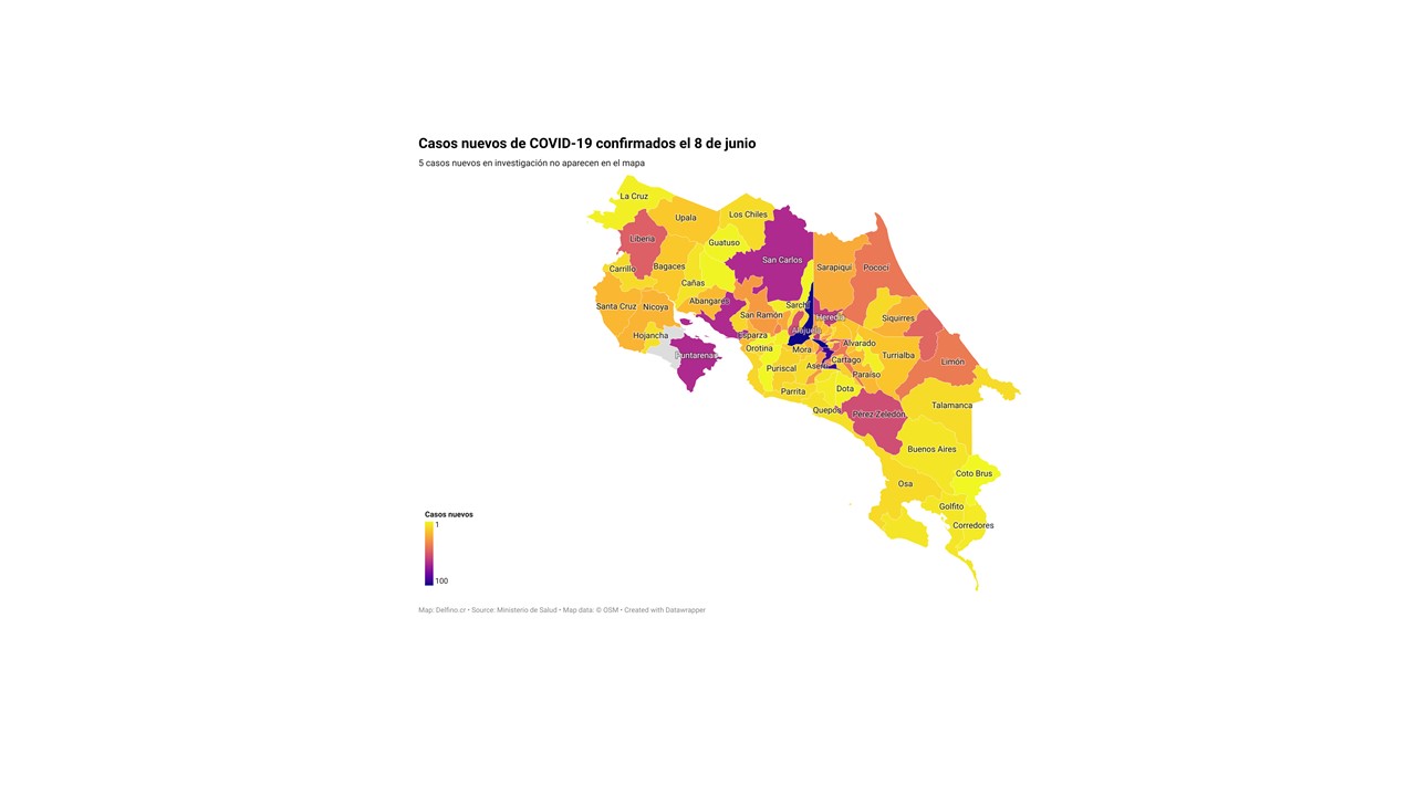 El Ministerio de Salud de Costa Rica informó la tarde de hoy que los 1900 casos nuevos de COVID-19 registrados en el país se ubican en 81 de los 82 cantones. El único que no reportó casos nuevos fue Nandayure.