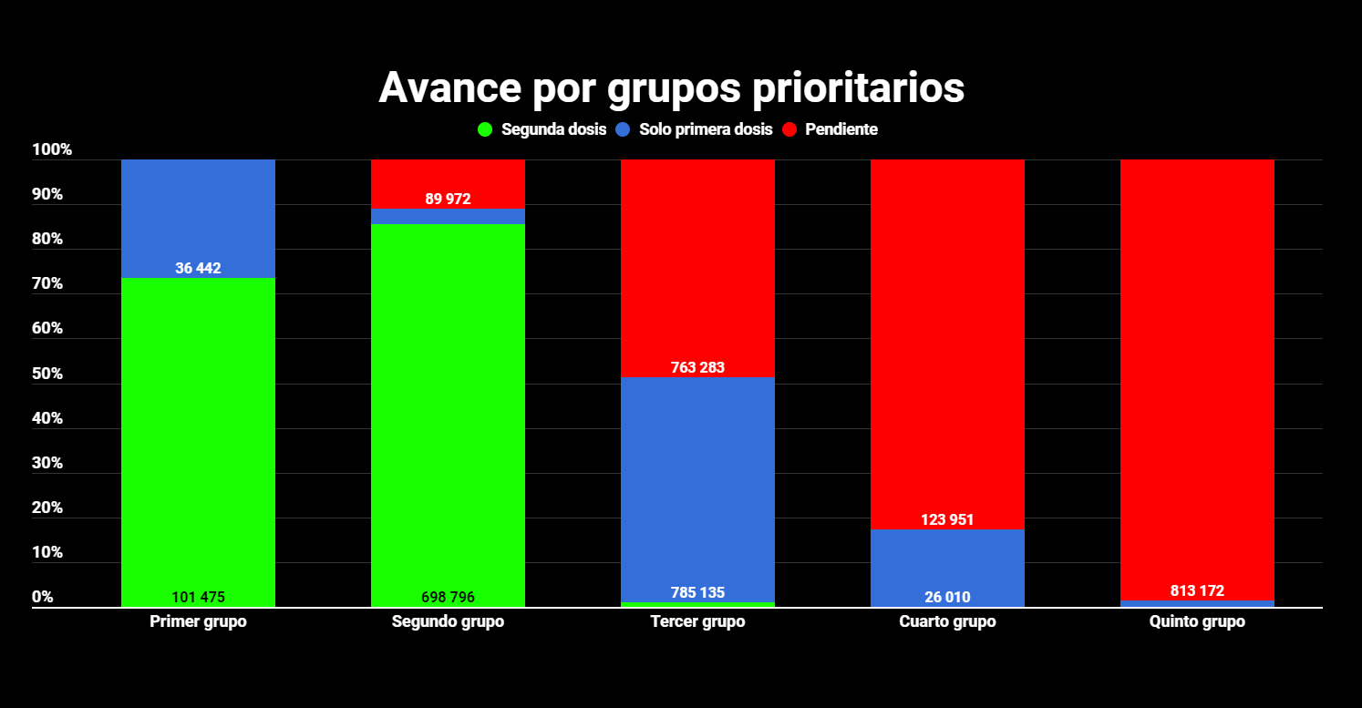 En el primer grupo prioritario, integrado por unas 110.000 personas de la primera línea de respuesta contra la pandemia, adultos mayores institucionalizados en centros de larga estancia y sus cuidadores, se registra la aplicación de 239.392 dosis de vacuna (+4) de las cuales 137.917 corresponden a primeras dosis (+0) y 101.475 a segundas dosis (+4). Así las cosas, el 125.37% del estimado original de personas que integran el grupo 1 ya recibió la primera dosis y el 92.25% del total tiene su esquema completo.