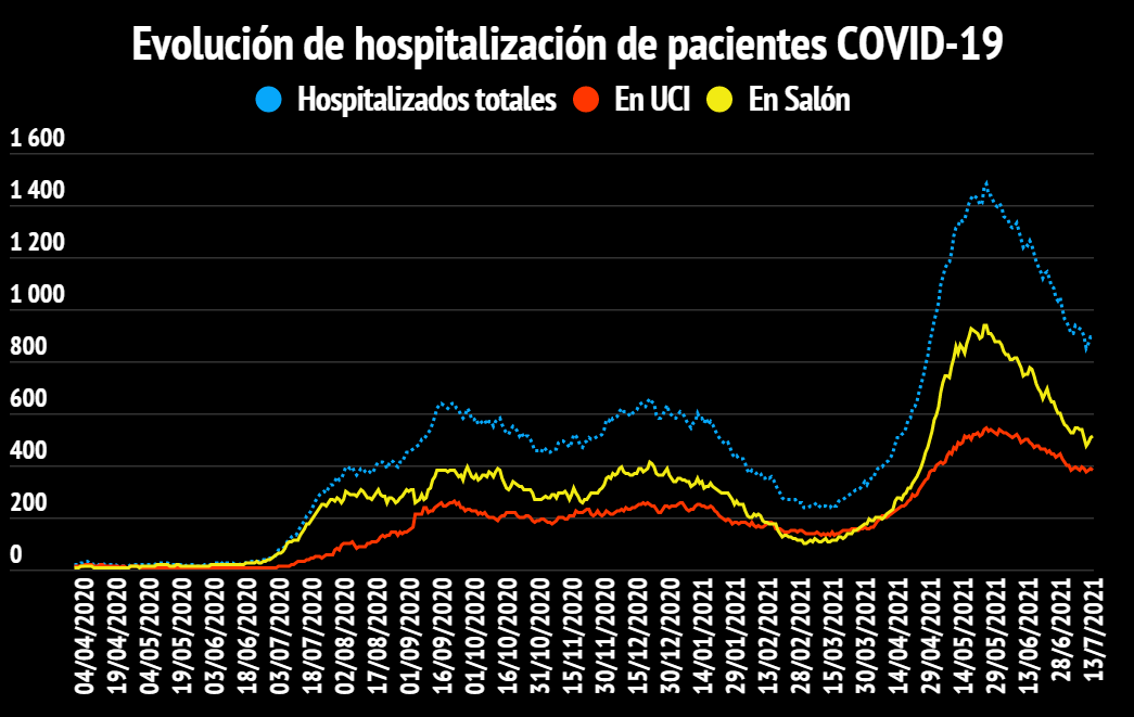 Hay 893 personas hospitalizadas (-1) de las cuales 382 están internadas en Unidades de Cuidados Intensivos (-6) con edades de entre 0 a 91 años.