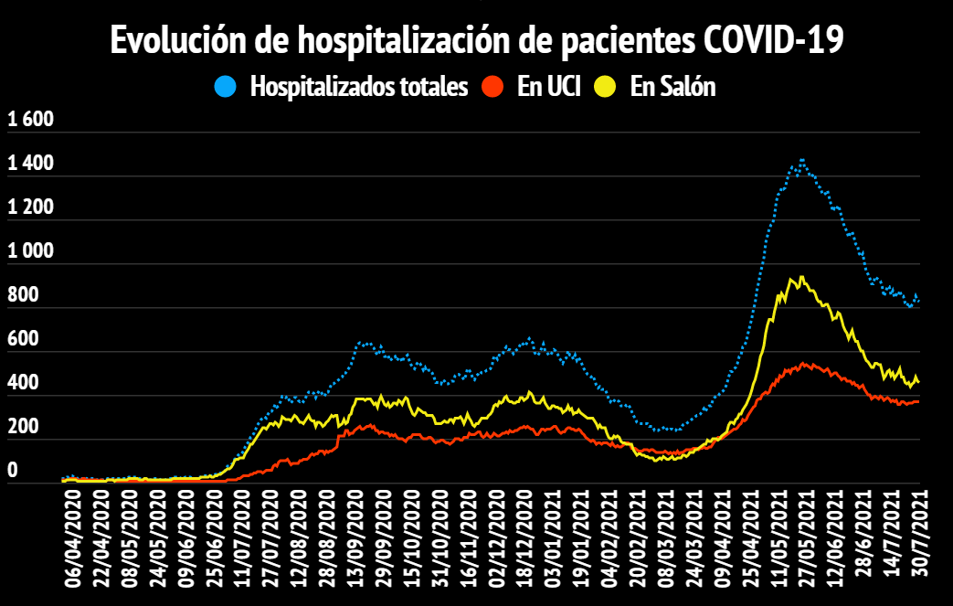 Hay 821 personas hospitalizadas (-8) de las cuales 364 están internadas en Unidades de Cuidados Intensivos (-3) con edades de entre 0 a 99 años.