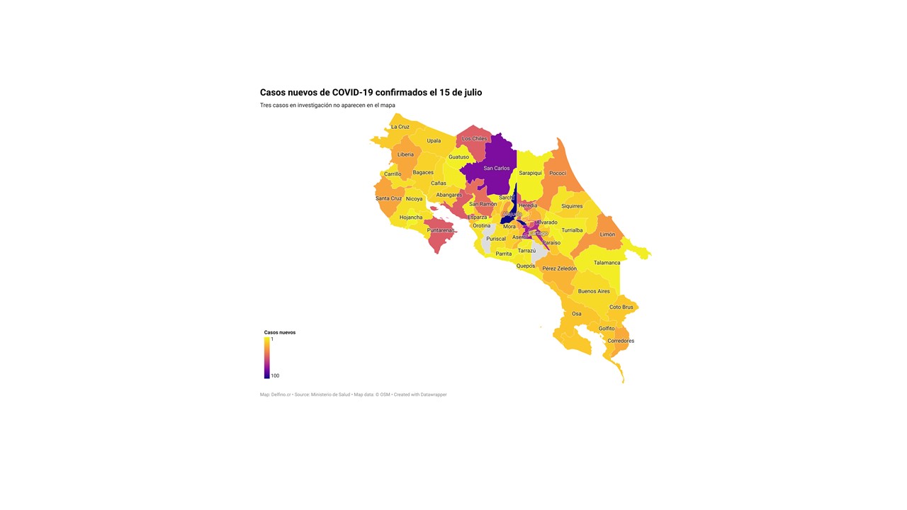 Otros 3 casos nuevos no fueron ubicados en ningún cantón pues siguen bajo investigación. El número de casos pendientes de domicilio cantonal asciende ya a 693, de los cuales 189 casos están activos.