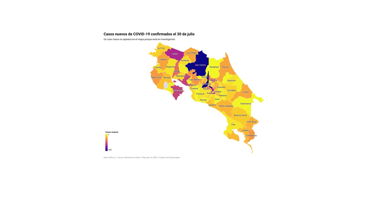 El Ministerio de Salud de Costa Rica informó la tarde de hoy que los 1608 casos nuevos de COVID-19 registrados en el país se ubican en 81 de los 82 cantones, el único que no reportó casos fue Hojancha.