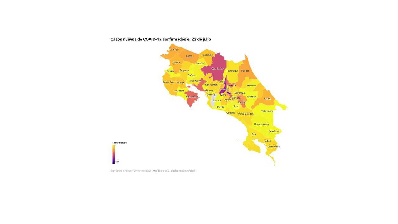 El Ministerio de Salud de Costa Rica informó la tarde de hoy que los 1139 casos nuevos de COVID-19 registrados en el país se ubican en 81 de los 82 cantones. El único que no reportó casos nuevos fue Turrubares.
