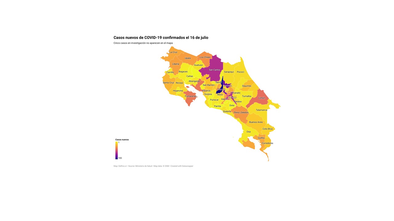 Otros 5 casos nuevos no fueron ubicados en ningún cantón pues siguen bajo investigación. El número de casos pendientes de domicilio cantonal asciende ya a 679, de los cuales 175 casos están activos.