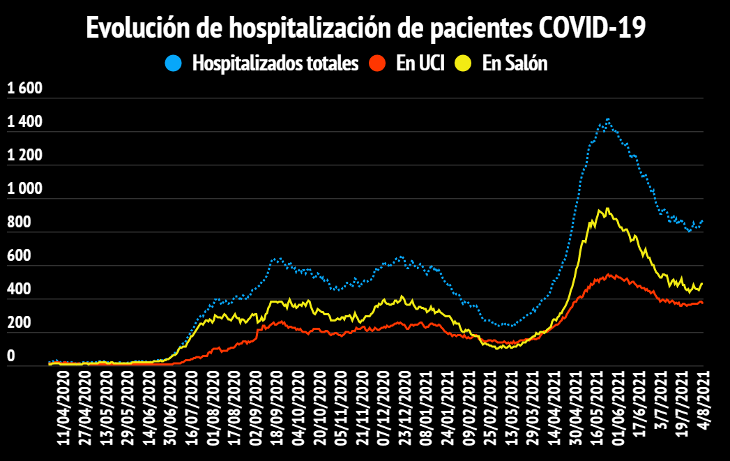 Hay 852 personas hospitalizadas (-16) de las cuales 368 están internadas en Unidades de Cuidados Intensivos (-13) con edades de entre 1 a 88 años.