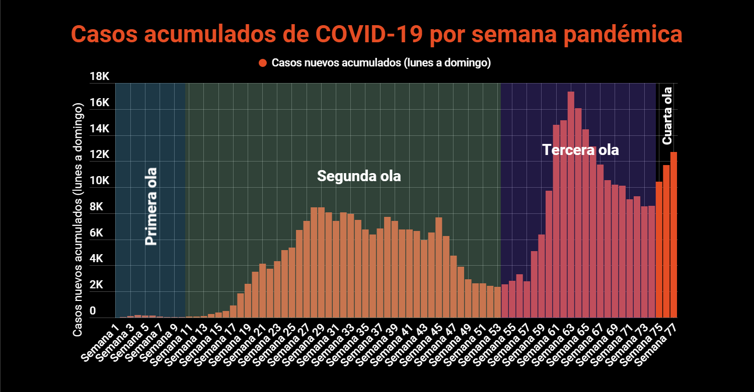 La semana pandémica 77 que terminó el domingo registró 12.691 casos nuevos de COVID-19, un incremento del 8.5% respecto a la semana 76. Asimismo, los fallecimientos subieron 15% al pasar de 92 a 106.
