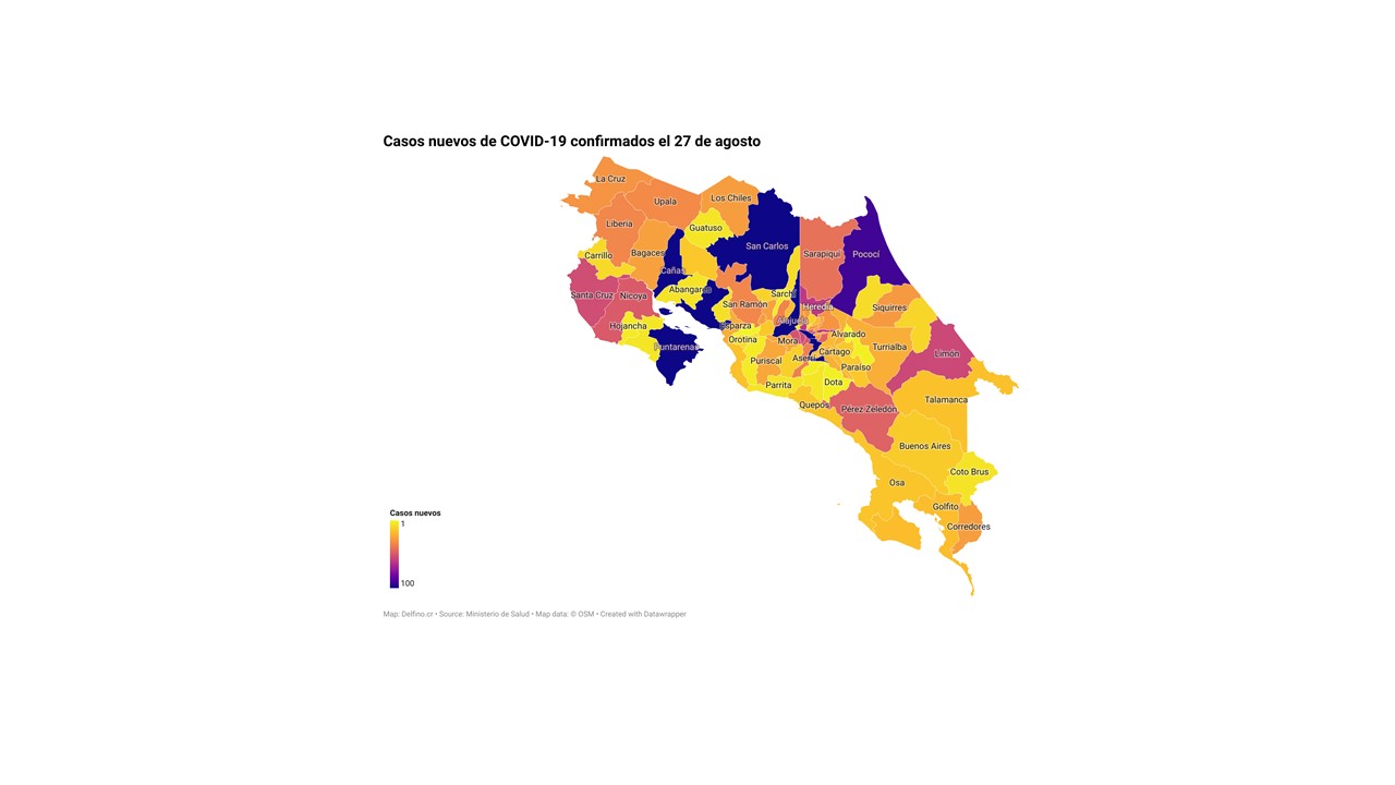 El Ministerio de Salud de Costa Rica informó la tarde de hoy que los 2787 casos nuevos de COVID-19 registrados se ubican en los 82 cantones del país.