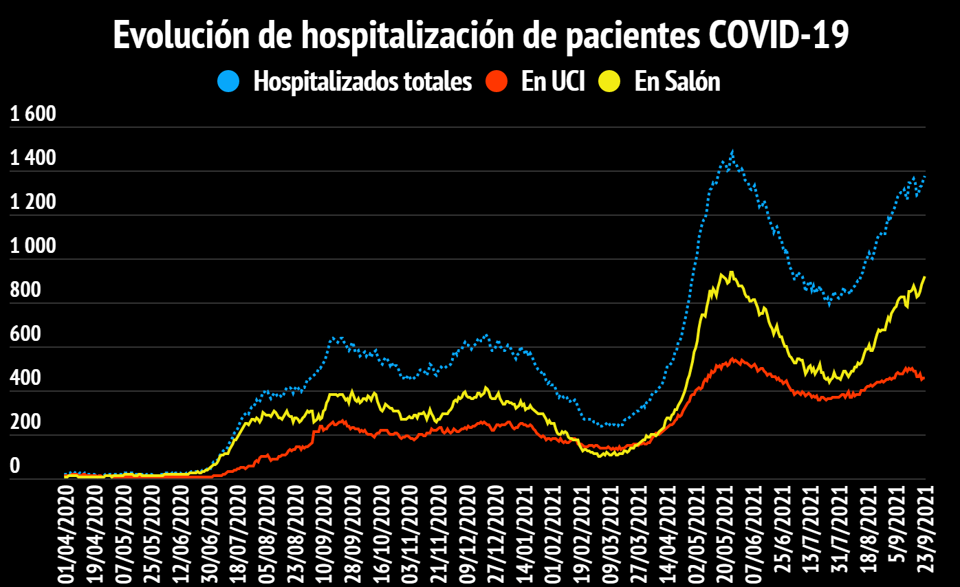 Hay 1372 personas hospitalizadas (+18) de las cuales 454 están internadas en Unidades de Cuidados Intensivos (+1) con edades de entre 0 a 92 años.