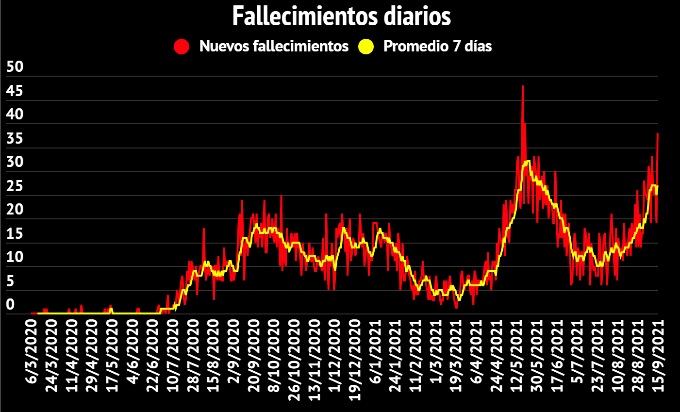 Datos clave del día: La cifra de fallecimientos de este miércoles es la tercera más alta de toda la pandemia. La cifra de hospitalizados es la más alta desde el 2 de junio. La incidencia semanal bajó tres puntos hasta los 299 casos diarios por cada 100 mil habitantes; mientras que el promedio semanal de casos se sitúa en 2211 casos al día.