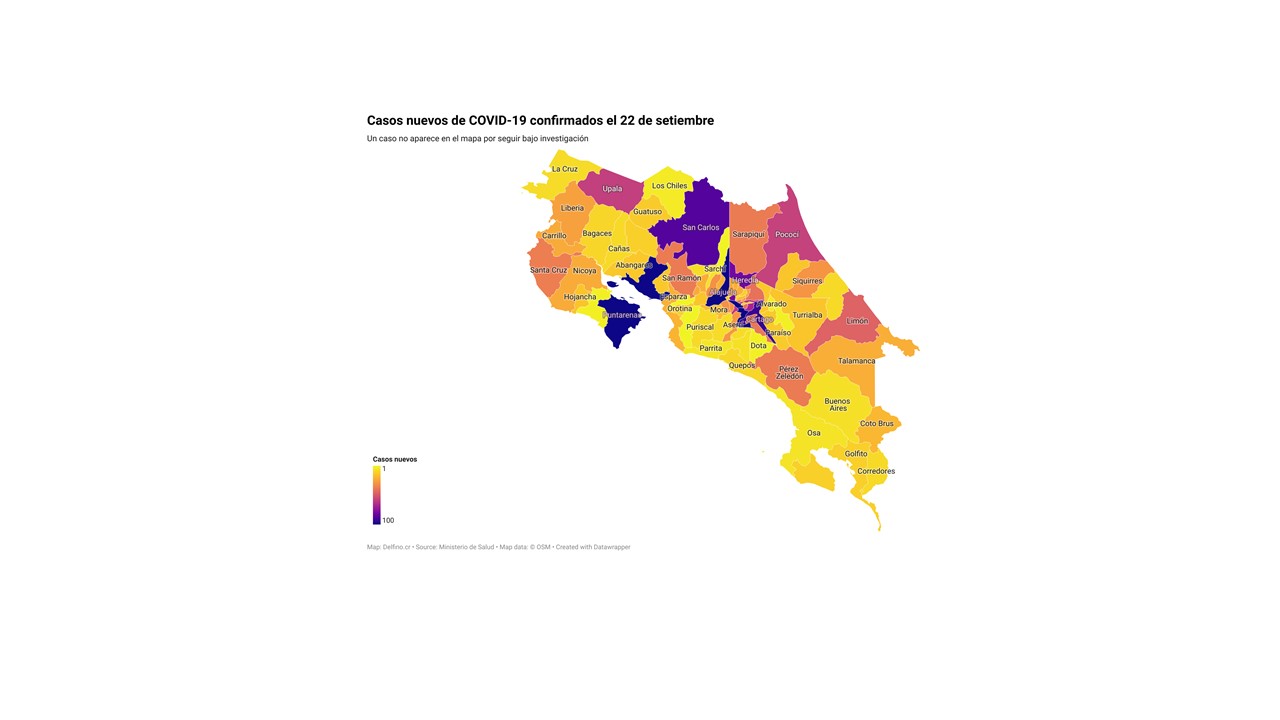 El Ministerio de Salud de Costa Rica informó la tarde de hoy que los 2547 casos nuevos de COVID-19 registrados el 22 de setiembre se ubican en los 82 cantones del país.