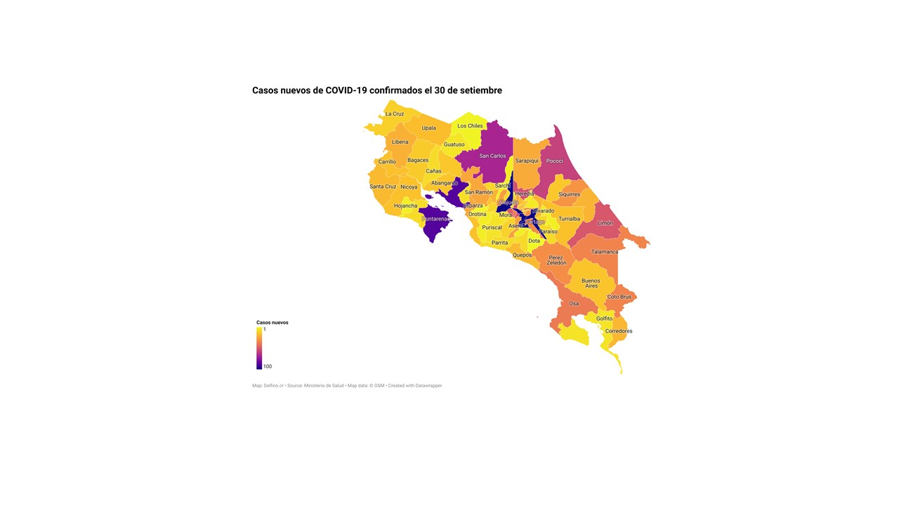 El Ministerio de Salud de Costa Rica informó la tarde de hoy que los 2072 casos nuevos de COVID-19 registrados en el país se ubican los 82 cantones del país.